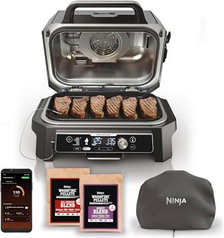 * Included Accessories: Grill Grate, Crisper Basket, Grease Tray, Woodfire Pellet Scoop, Ninja Woodfire Pellets (Starter Pack)